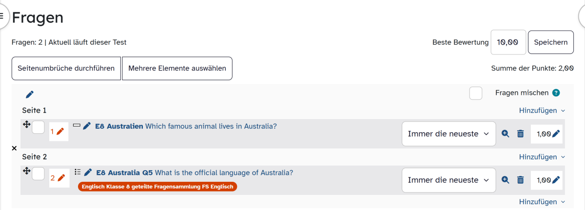 Im Test ist in der Fragenübersicht durch einen Badge angezeigt, in welcher Fragensammlung die Frage enthalten ist.