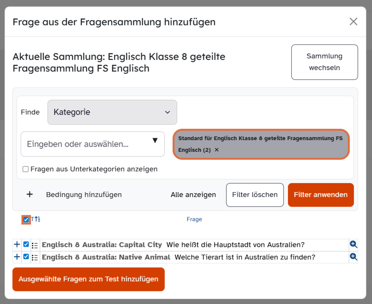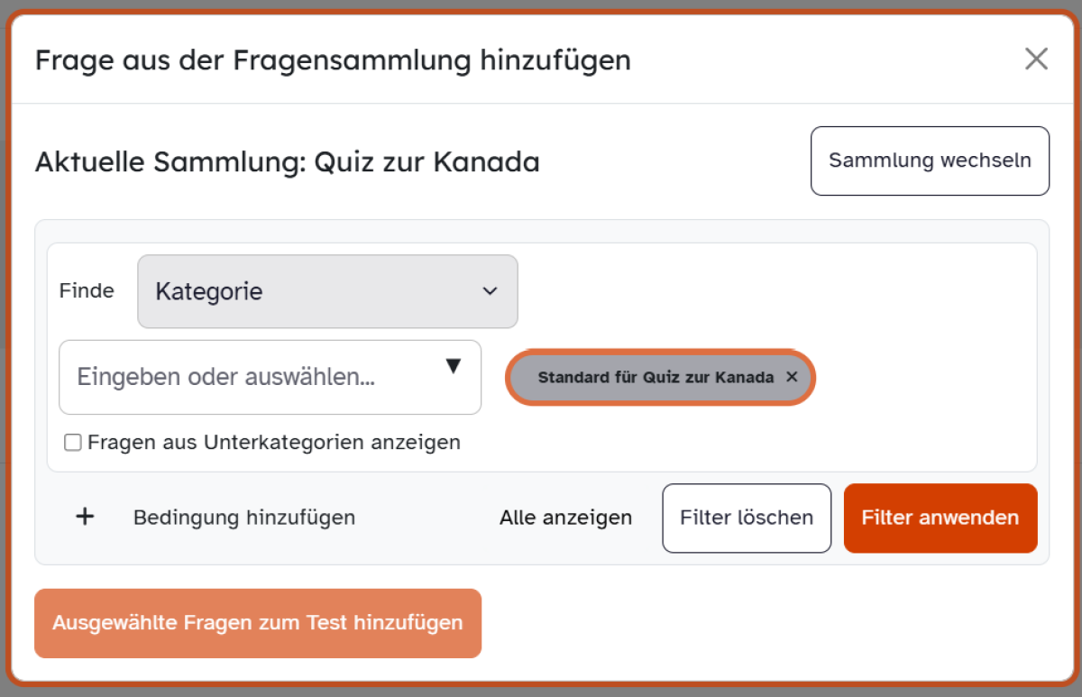 Sollte eine Frage fehlen, kann es nützlich sein, die Option Fragen aus Unterkategorien anzeigen zu aktivieren.