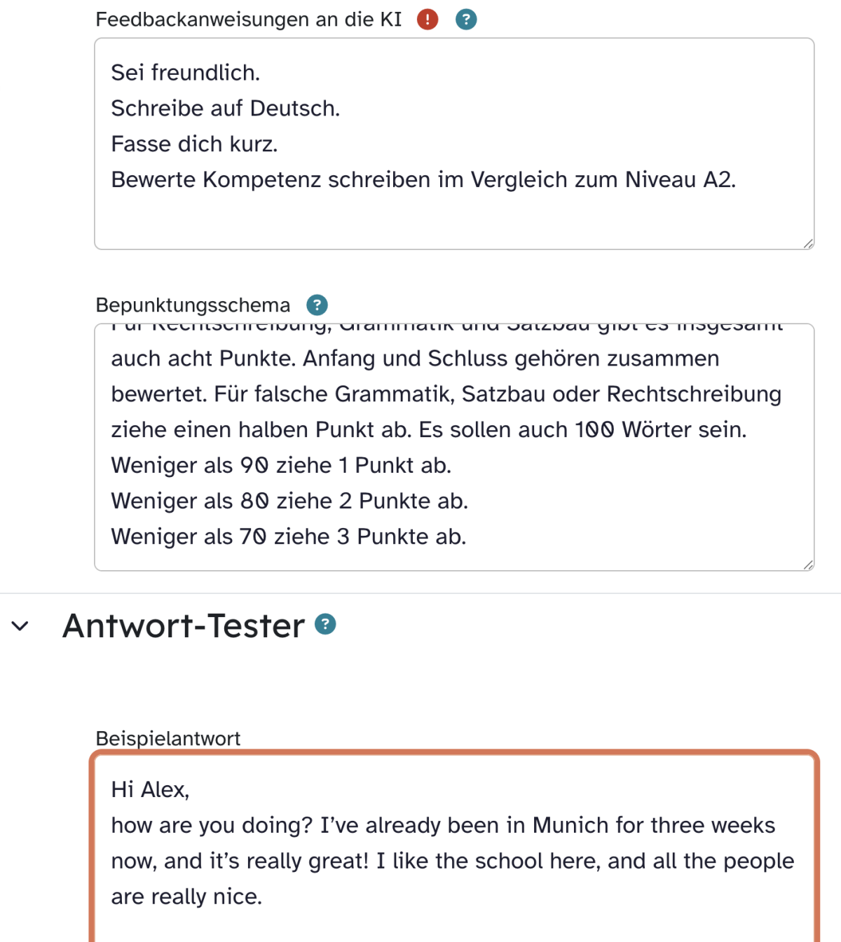 Im Feld Feedbackanweisungen an die KI erstellen Sie einen Leitfaden für die KI, nach dem diese das Feedback vornehmen soll. Sie können z. B. festlegen, in welcher Sprache die Rückmeldung geschrieben sein soll.