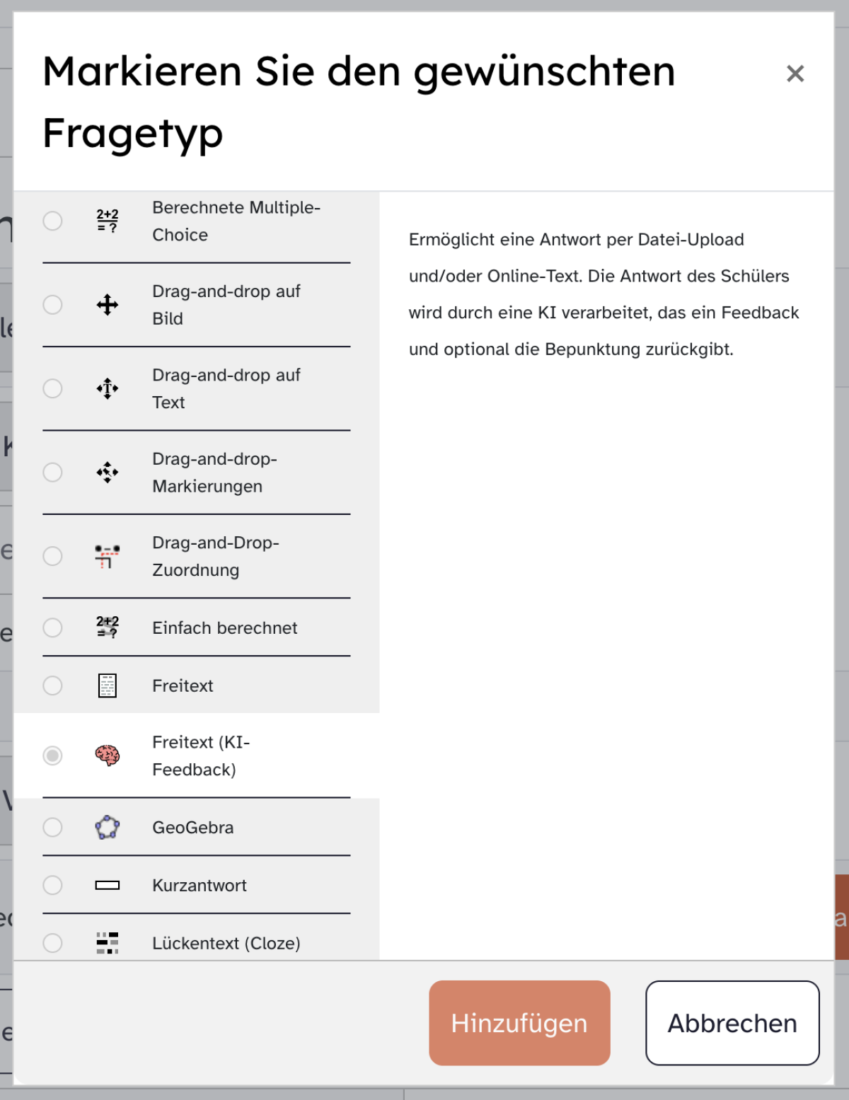Markieren Sie den Fragetyp Freitext (KI-Feedback) und bestätigen Sie Ihre Auswahl durch einen Klick auf Hinzufügen. Durch diesen Fragetyp können Sie den Schülerinnen und Schülern ein KI generiertes Feedback und optional eine Benotung der geschriebenen Antwort automatisch zurückgeben.