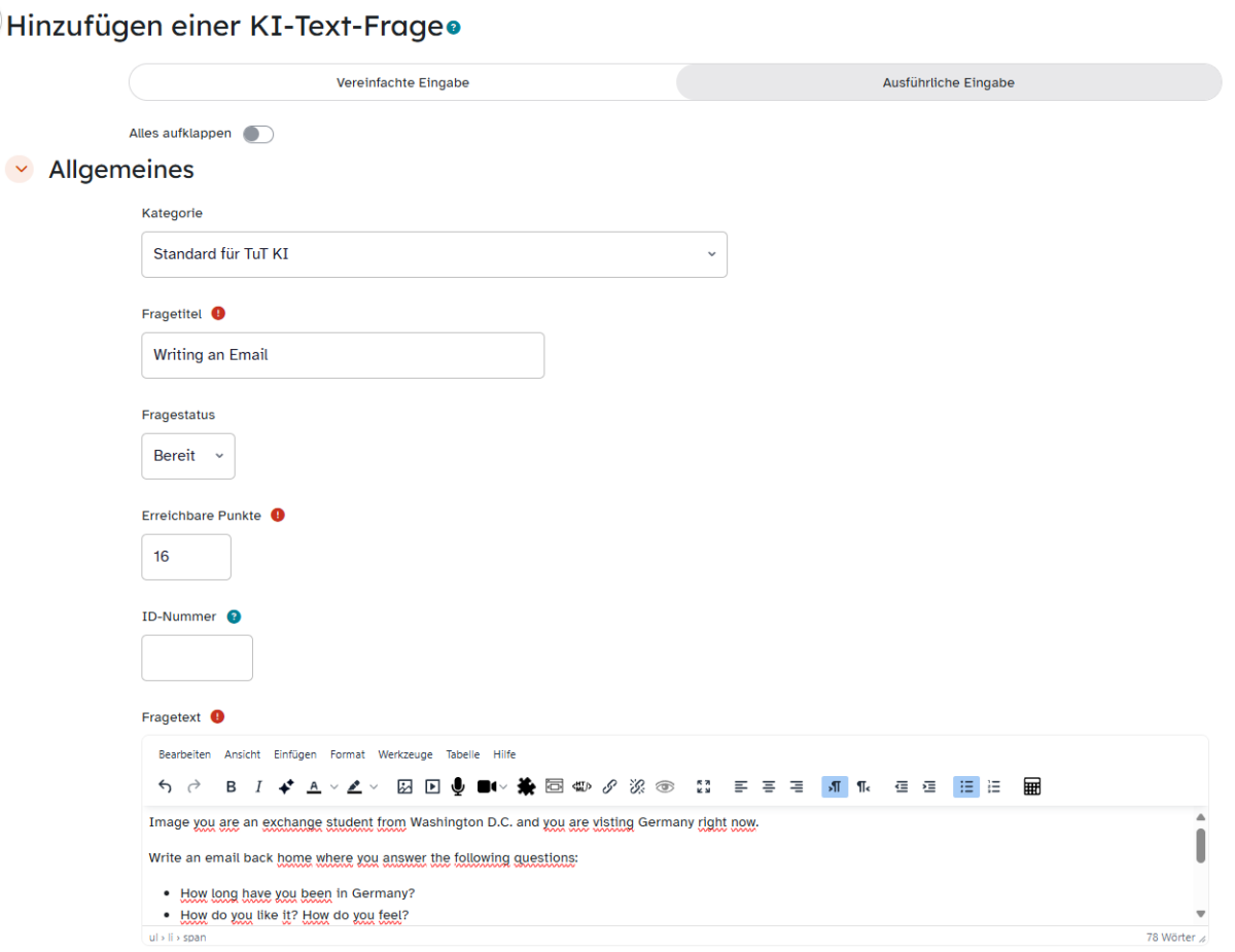 Test - Fragetyp Freitext (KI-Feedback) hinzufügen