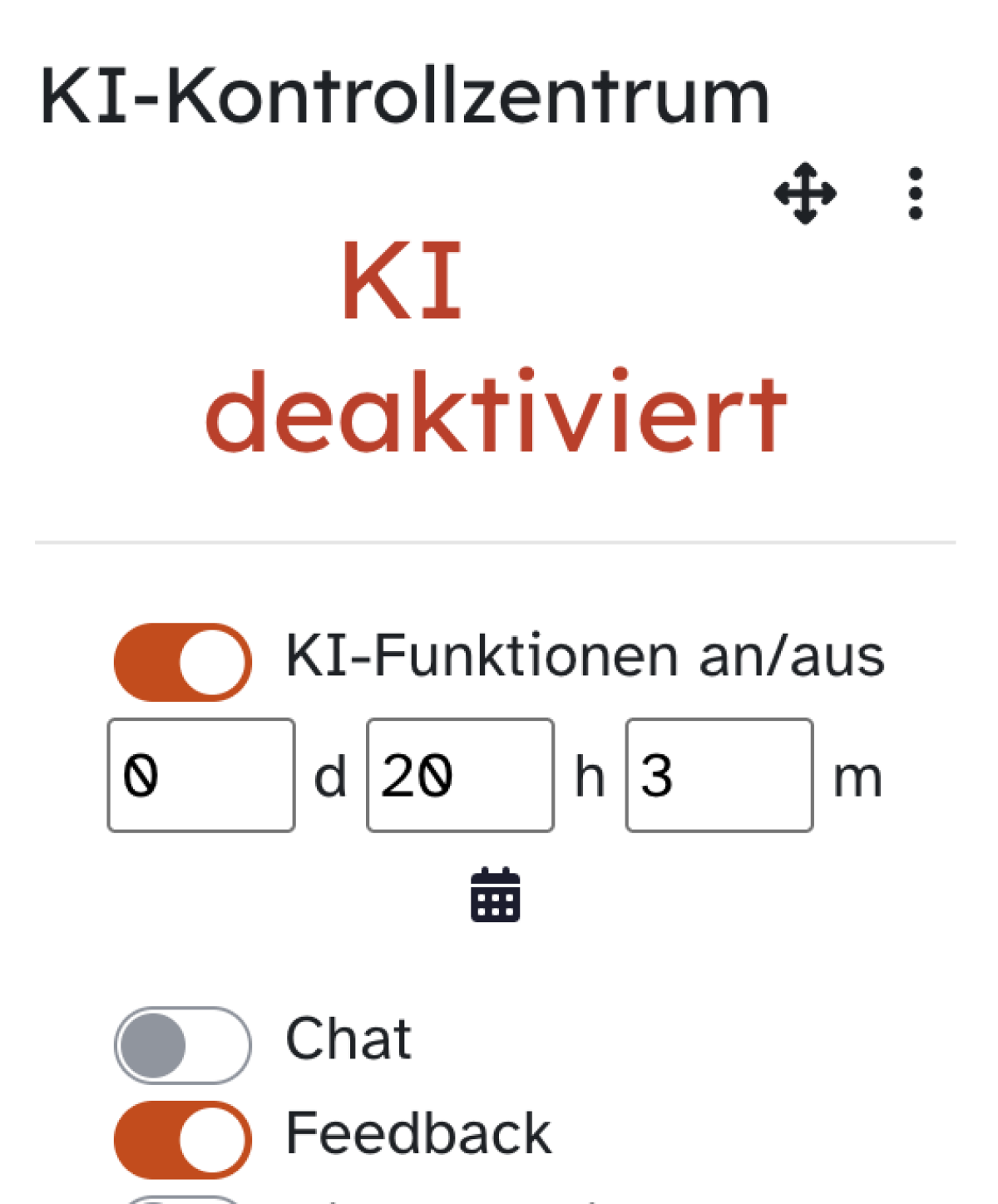 Öffnen Sie hierzu über den Pfeil an der rechten Seite das Blöcke-Menü. Schalten Sie die KI-Funktion mittels KI-Funktionen an/aus ein, wählen Sie ein Ablaufzeit und aktivieren Sie den Schieberegler Feedback. Speichern Sie abschließend die Aktivierung.