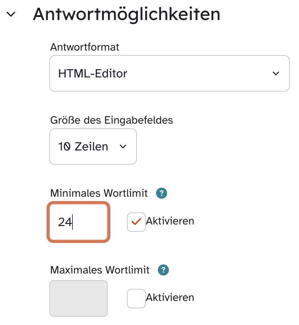 Unter Antwortmöglichkeiten legen Sie fest, ob eine minimale, beziehungsweise eine maximale Anzahl an Wörtern, die die Schülerinnen und Schüler eingeben müssen, verlangt wird. Ebenfalls können Sie hier die Größe des Eingabefeldes editieren.