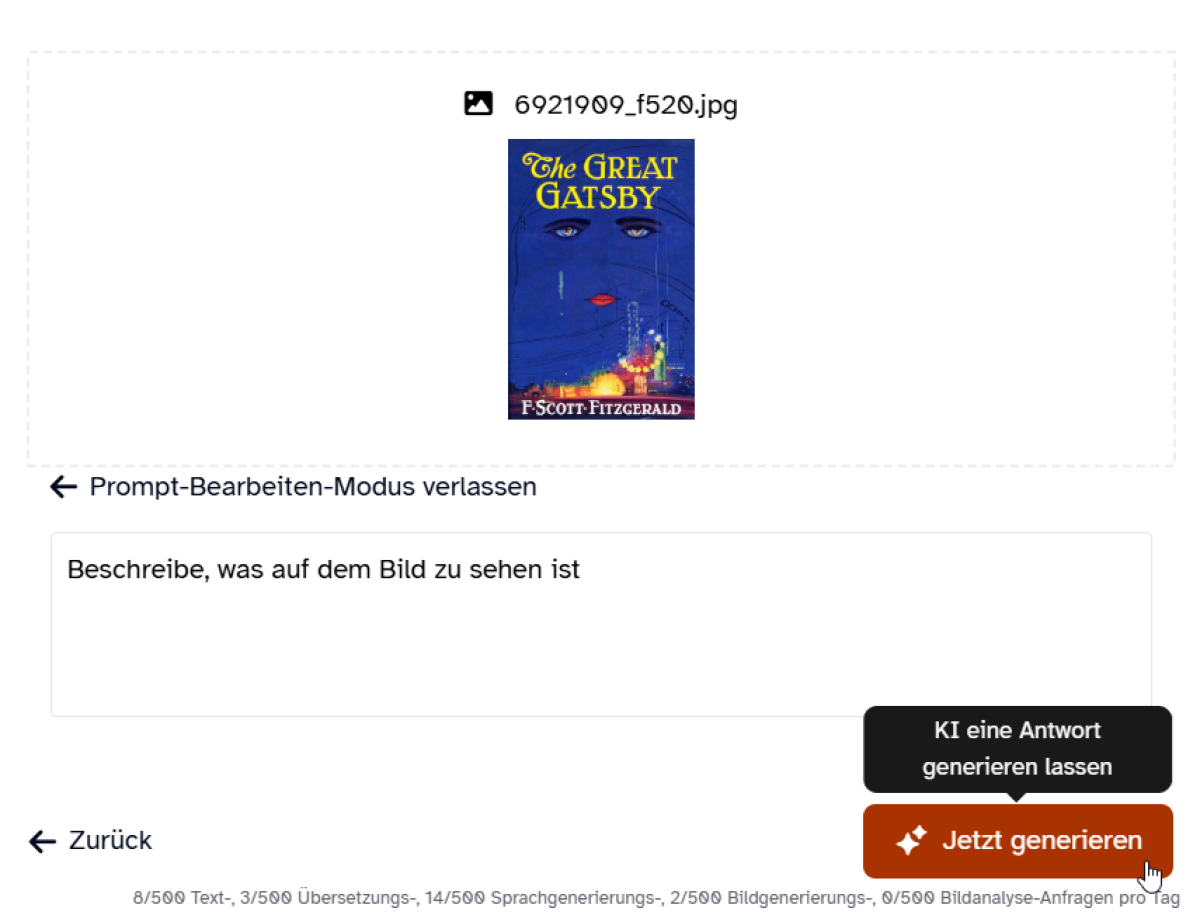 Sofern Sie der Bildbeschreibung Elemente hinzufügen möchten, die unbedingt von der KI erwähnt werden sollen, klicken Sie auf Prompt-Bearbeiten-Modus und fügen Sie im freien Textfeld bei Beschreibe, was auf dem Bild zu sehen ist eine zusätzliche Beschreibung hinzu.