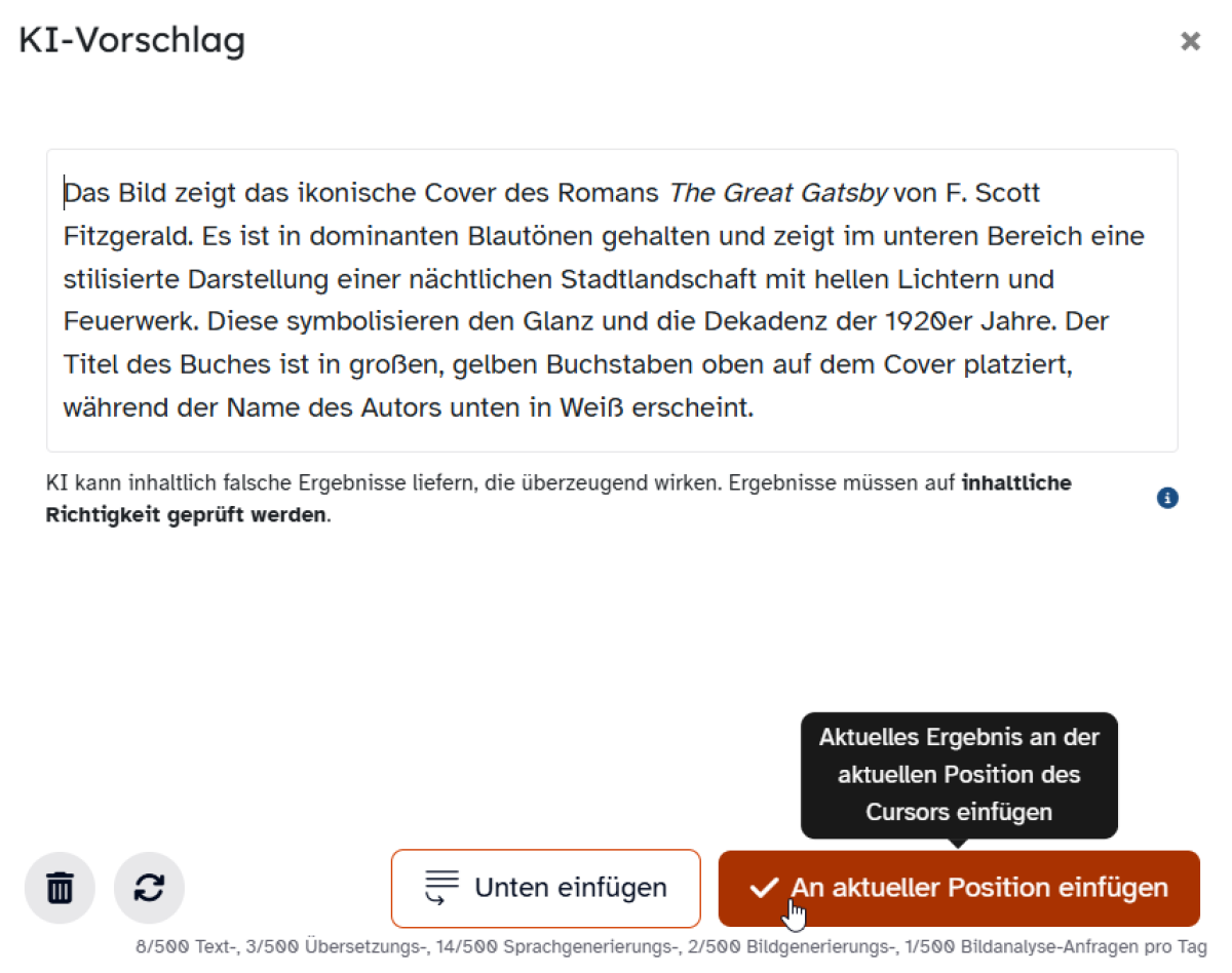 Beachten Sie bitte bei der Verwendung, dass sich pro Tag nur 500 Bildbeschreibungen über das KI-Feature erstellen lassen, da dieser Vorgang einen erhöhten Energiebedarf erfordert.