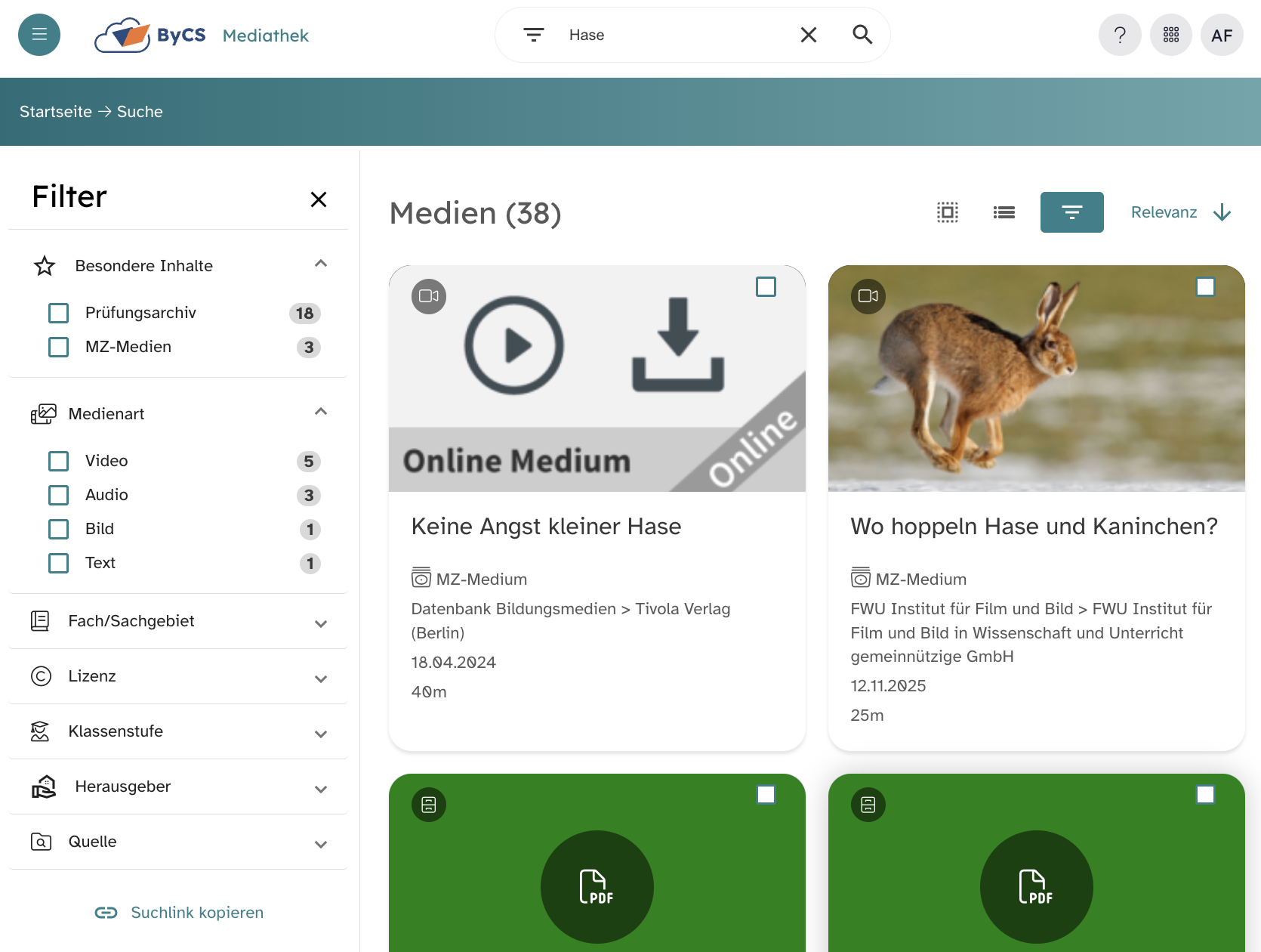 Du bist in der Anwendung Mediathek und möchest nach Medien oder Prüfungen suchen. Hier zeigen wir dir, wie du dich in der Mediathek zurechtfindest.