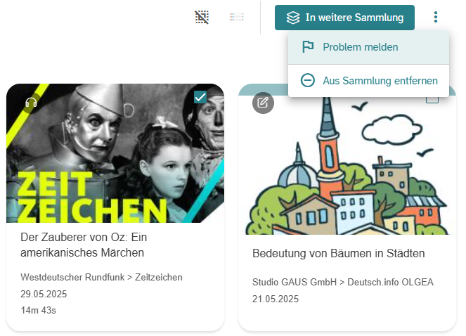 Markieren Sie in der Sammlung mit einem Klick auf die Auswahlboxen der Kacheln alle Medien, die Sie aus der Mediensammlung löschen möchten. Durch einen Klick auf das Drei-Punkte-Menü öffnet sich ein Kontextmenü.