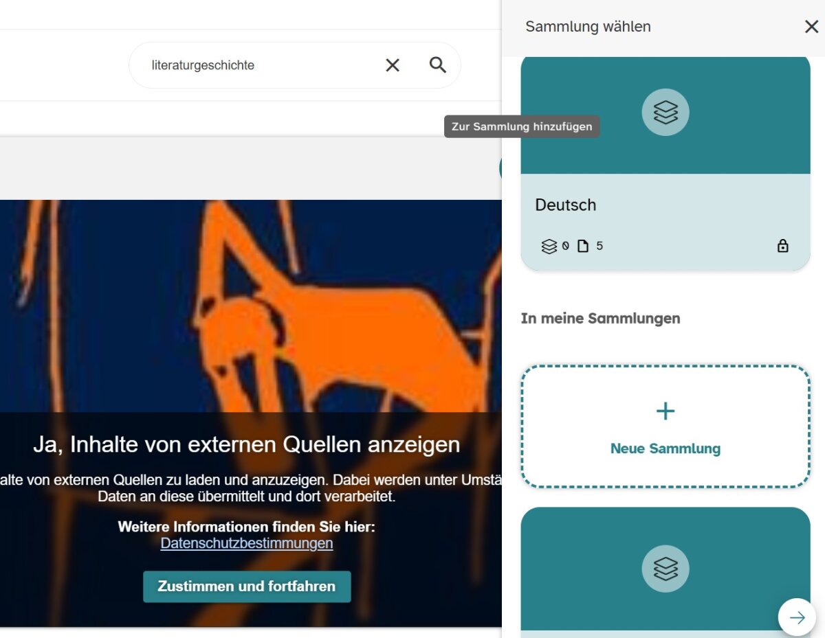 Klicke auf den Button Zur Sammlung hinzufügen. Es öffnet sich die Seitenleiste mit einem Suchfeld Sammlung suchen, den zuletzt verwendeten Sammlungen und darunter deinen bereits angelegten Sammlungen. Dazwischen findest du auch die Möglichkeit, eine neue Sammlung anzulegen.