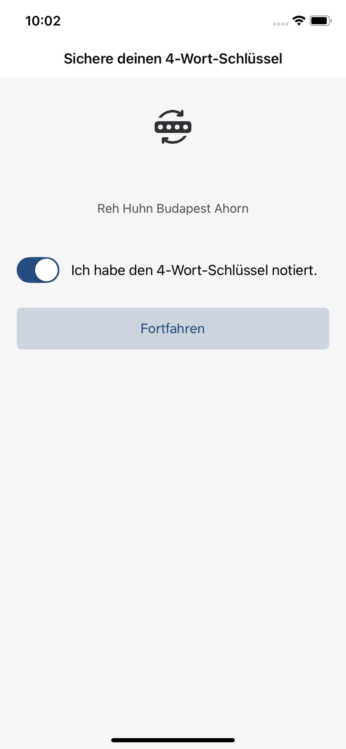 Diese vier automatisch festgelegten Substantive sollten Sie sich unbedingt notieren und gut aufbewahren. Nachdem Sie den 4-Wort-Schlüssel gesichert haben, bestätigen Sie dies mithilfe des Schiebereglers Ich habe den 4-Wort-Schlüssel notiert. Erst anschließend haben Sie die Möglichkeit, auf Fortfahren zu tippen.