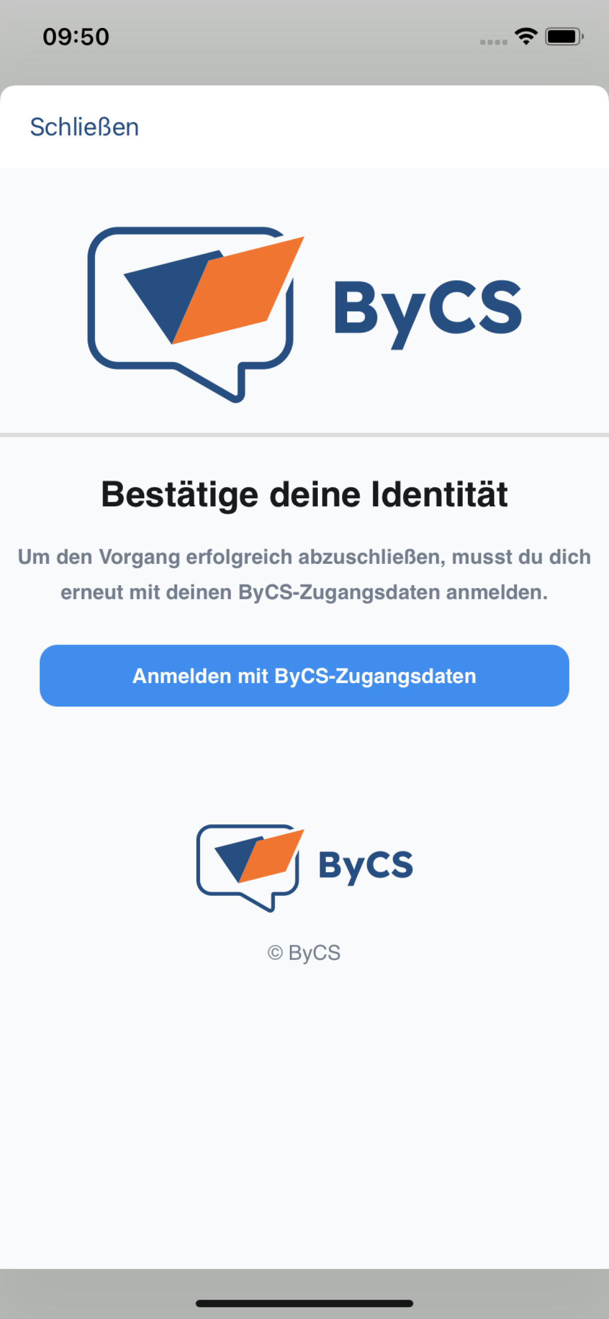 Daraufhin werden Sie erneut aufgefordert, Ihre Identität zu bestätigen. In diesem Fenster können Sie den Authentifizierungsprozess durch Tippen auf Anmelden mit ByCS-Zugangsdaten starten. Geben Sie anschließend erneut Ihre ByCS-Zugangsdaten sowie Ihr Passwort ein und Tippen auf Login.