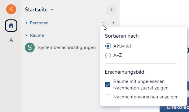 Hier siehst du Personen, mit denen du bereits Nachrichten geschrieben hast oder Chaträume, in denen du Mitglied bist. Über das 3-Punkte-Menü bei den Reitern Personen und Räume hast du die Möglichkeit, die Räume oder Personen zu sortieren und Einstellungen zum Erscheinungsbild vorzunehmen.