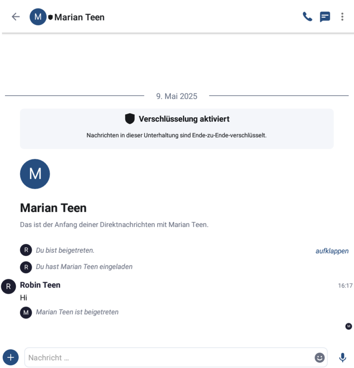 Über das Videokamera-Symbol kannst du ein Video mit der Kamera deines Gerätes aufnehmen und dieses im Anschluss dann im Chat teilen, sofern du in dem Raum die notwendigen Rechte hast.