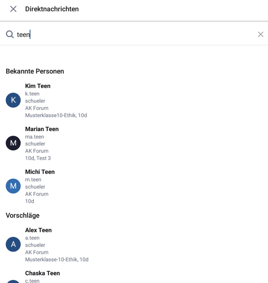 Finde Personen in deiner Schule, indem du den entsprechenden Namen in das Suchfeld eingibst. Um Personen an einer anderen Schule zu kontaktieren, benötigst du deren Messenger-ID (@ByCS-Kennung:messenger.bycs.de - z. B. @k.teen:messenger.bycs.de)