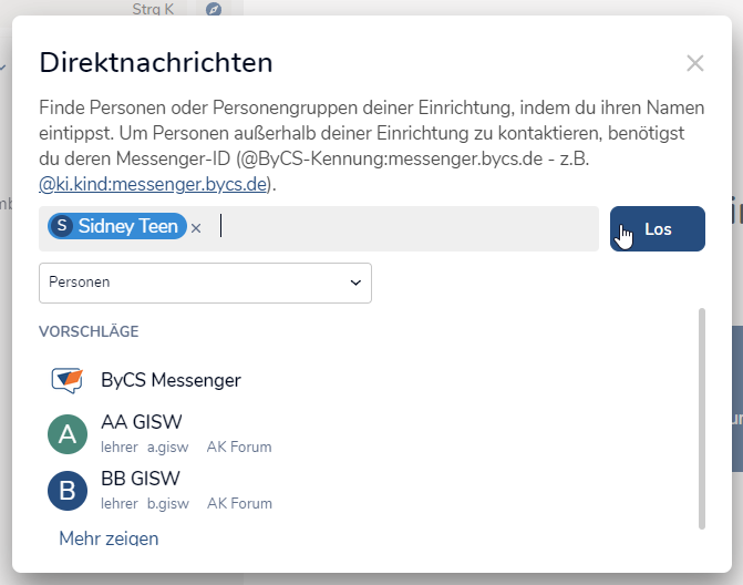 Über Neue Direktnachricht eröffnest du einen neuen Chatraum. Du erhältst Vorschläge, aus denen du die gewünschte Person auswählst. Alternativ findest du über das Suchfeld gezielt Personen, indem du ihre Namen eintippst. Klicke den richtigen Namen an, um einen Gesprächspartner hinzuzufügen.