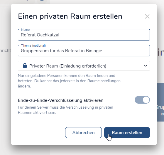 Die Funktion, selbstständig Chats zu erstellen, muss von deiner Schule freigeschaltet sein. Wenn du die Buttons zum Erstellen von Räumen nicht siehst, ist das Feature für dich gesperrt.