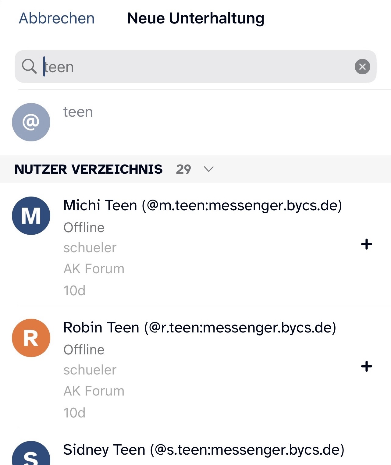 Finde Personen in deiner Schule, indem du den entsprechenden Namen in das Suchfeld eingibst. Um Personen an einer anderen Schule zu kontaktieren, benötigst du deren Messenger-ID (@ByCS-Kennung:messenger.bycs.de - z. B. @k.teen:messenger.bycs.de)