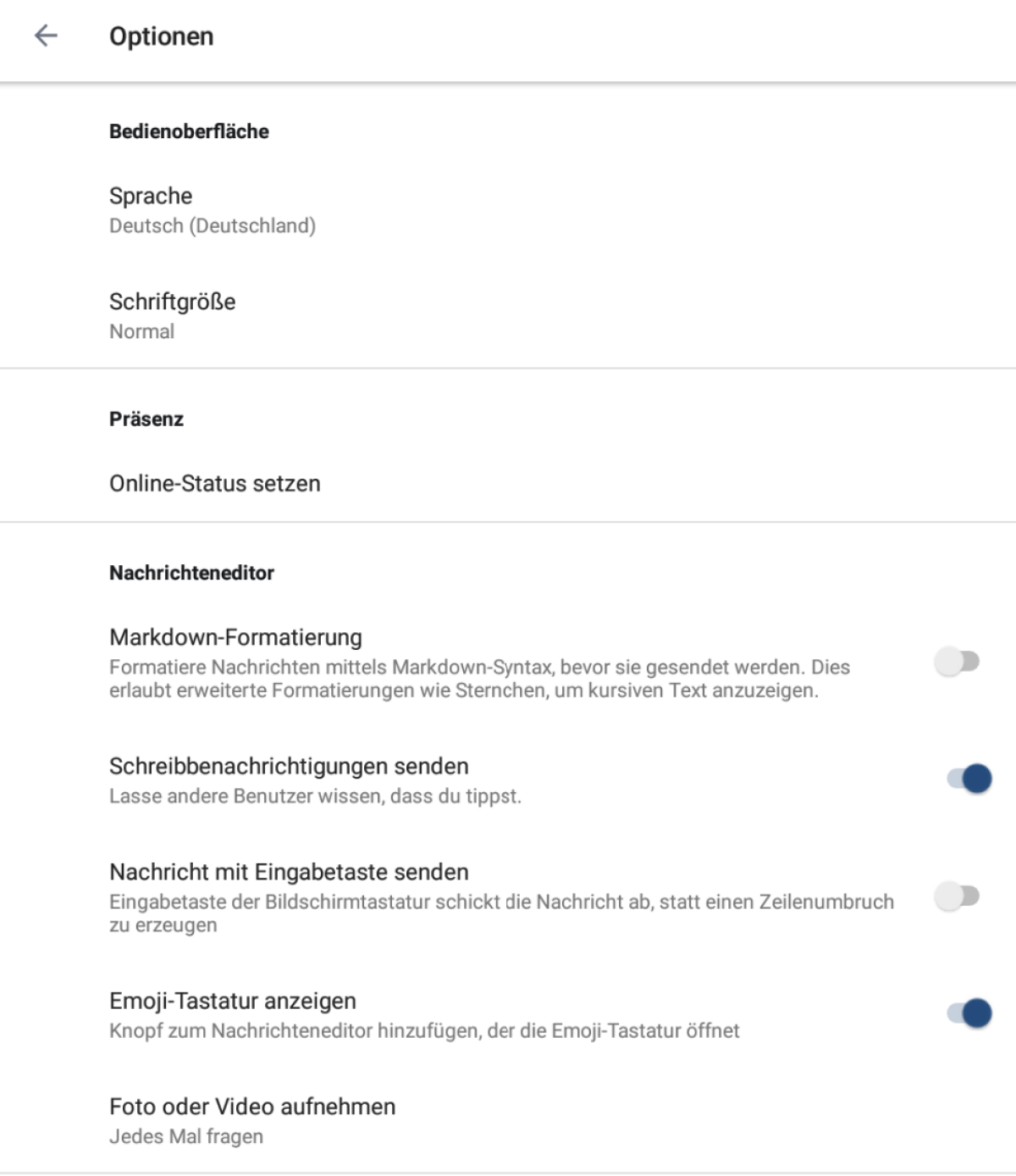 Unter Optionen hast du beispielsweise die Möglichkeit, die Sprache und Schriftgröße abzuändern sowie deinen Online-Status zu setzen oder eine Lesebestätigung anzeigen zu lassen oder den Nachrichtenstil anzupassen.