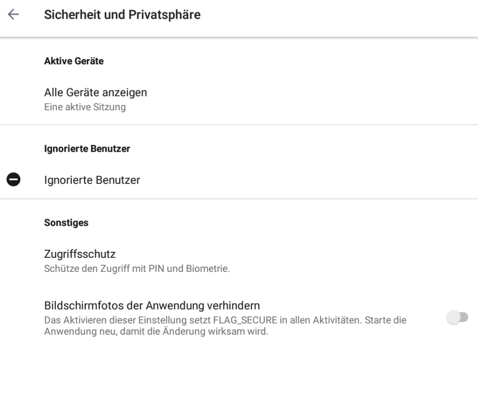 Mit Bildschirmfotos der Anwendung verhindern kannst du deaktivieren oder aktivieren, dass du Screenshots aus der App heraus machen kannst.