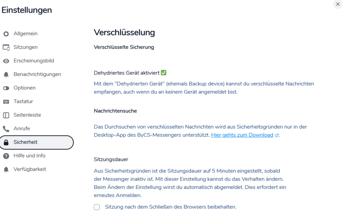 Unter Sicherheit erhältst du grundlegende Informationen über deine verschlüsselten Nachrichten, die Funktion der Nachrichtensuche sowie der Sitzungsdauer.