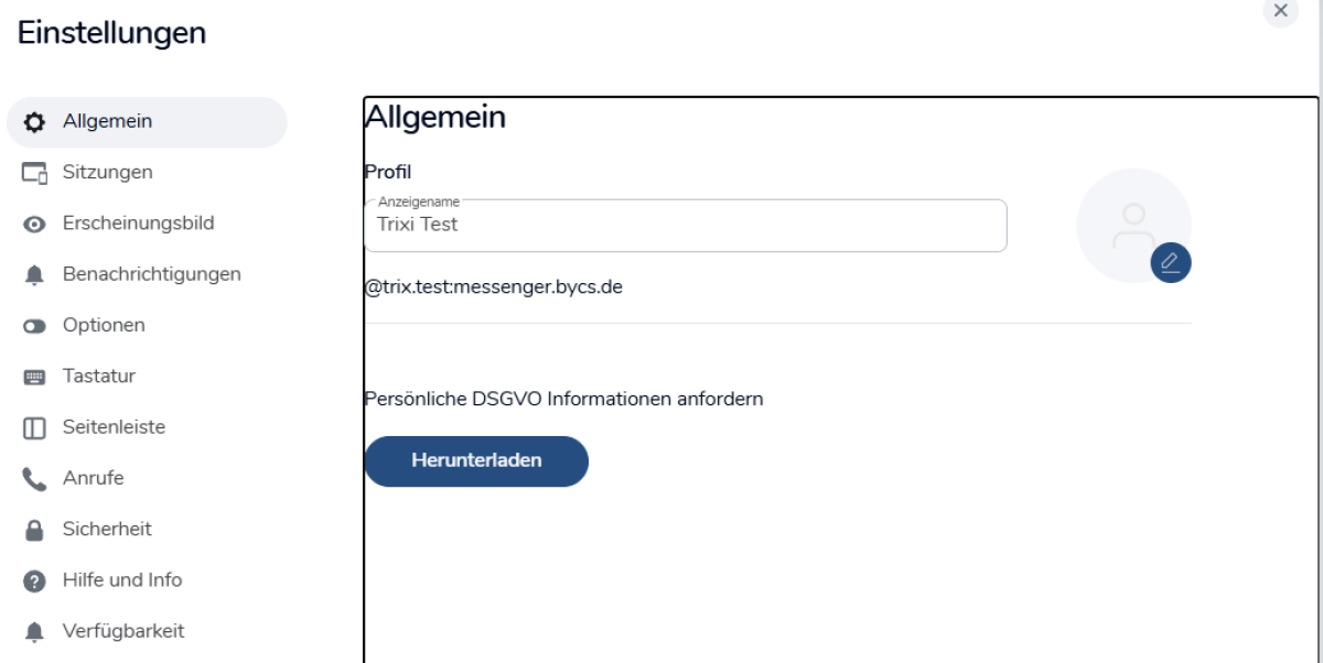 Es öffnet sich ein neues Fenster, in dem du Einstellungen zu verschiedenen Themen vornehmen kannst. Unter Allgemein findest du deinen im Messenger angezeigten Namen und kannst dein Profilbild über das Profil-Symbol ändern. Über den Button Herunterladen forderst du dir persönliche Informationen zum Datenschutz an.
