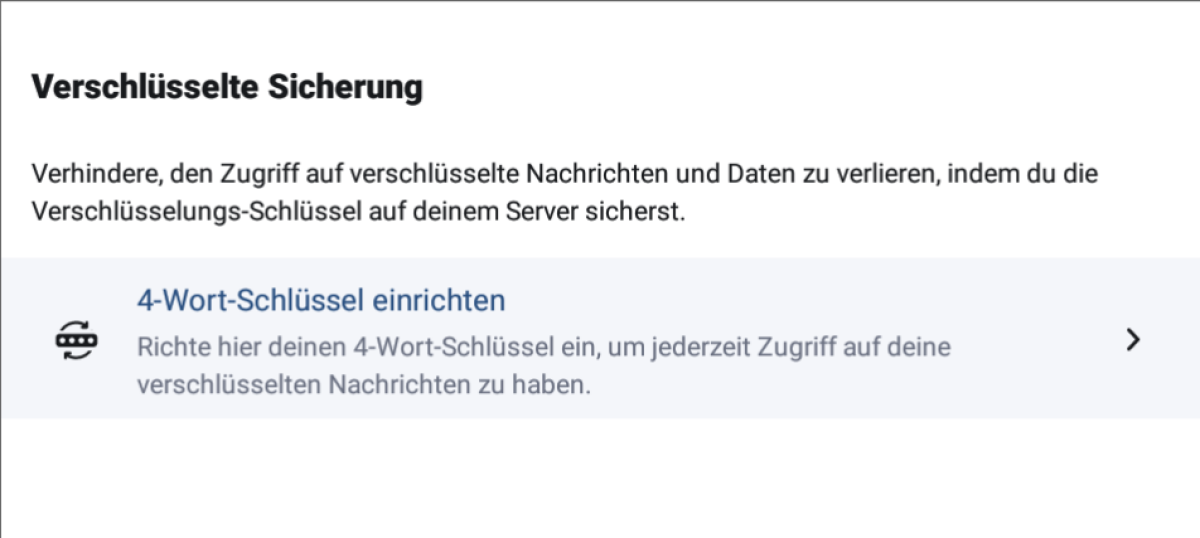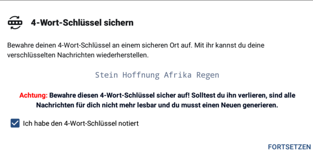 Notiere dir den 4-Wort-Schlüssel, den du bei dieser ersten Anmeldung erhältst, gut! Du musst diesen 4-Wort-Schlüssel bei jeder Neu-Anmeldung auf einem Gerät (z. B. einem weiteren Smartphone, einem Tablet, dem PC etc.) wieder eingeben, um dein Gerät zu verifizieren.