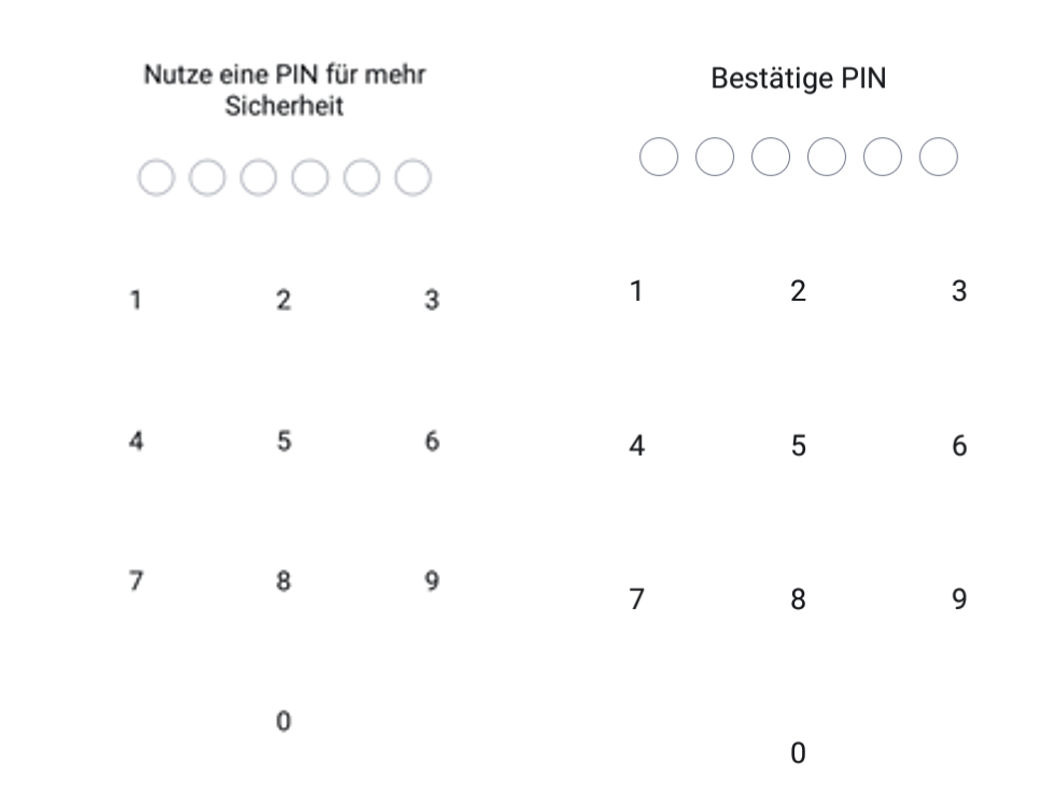Nun wirst du aufgefordert, eine PIN zu erstellen. Gib die von dir gewünschte PIN ein und bestätige deine PIN durch nochmalige Eingabe. Die gefüllten Kreise zeigen dir dabei an, wie viele Ziffern du schon gewählt hast.