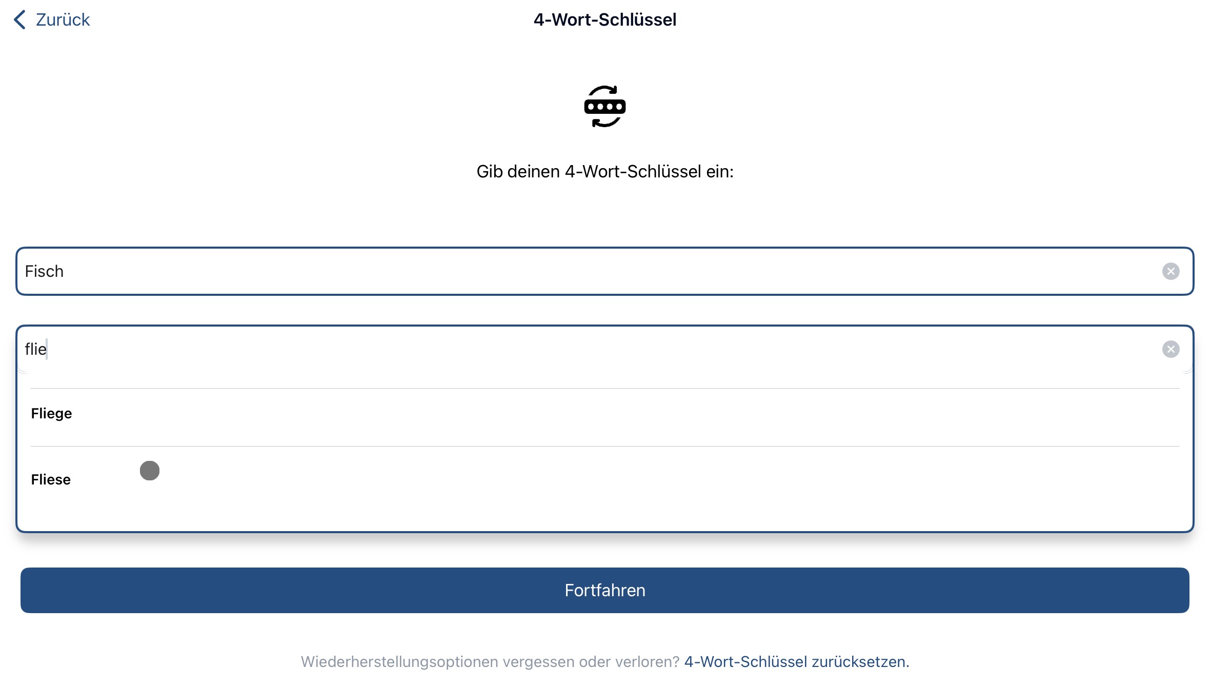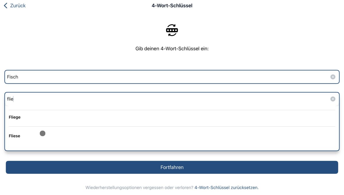 Notiere dir den 4-Wort-Schlüssel, den du bei dieser ersten Anmeldung erhältst, gut.