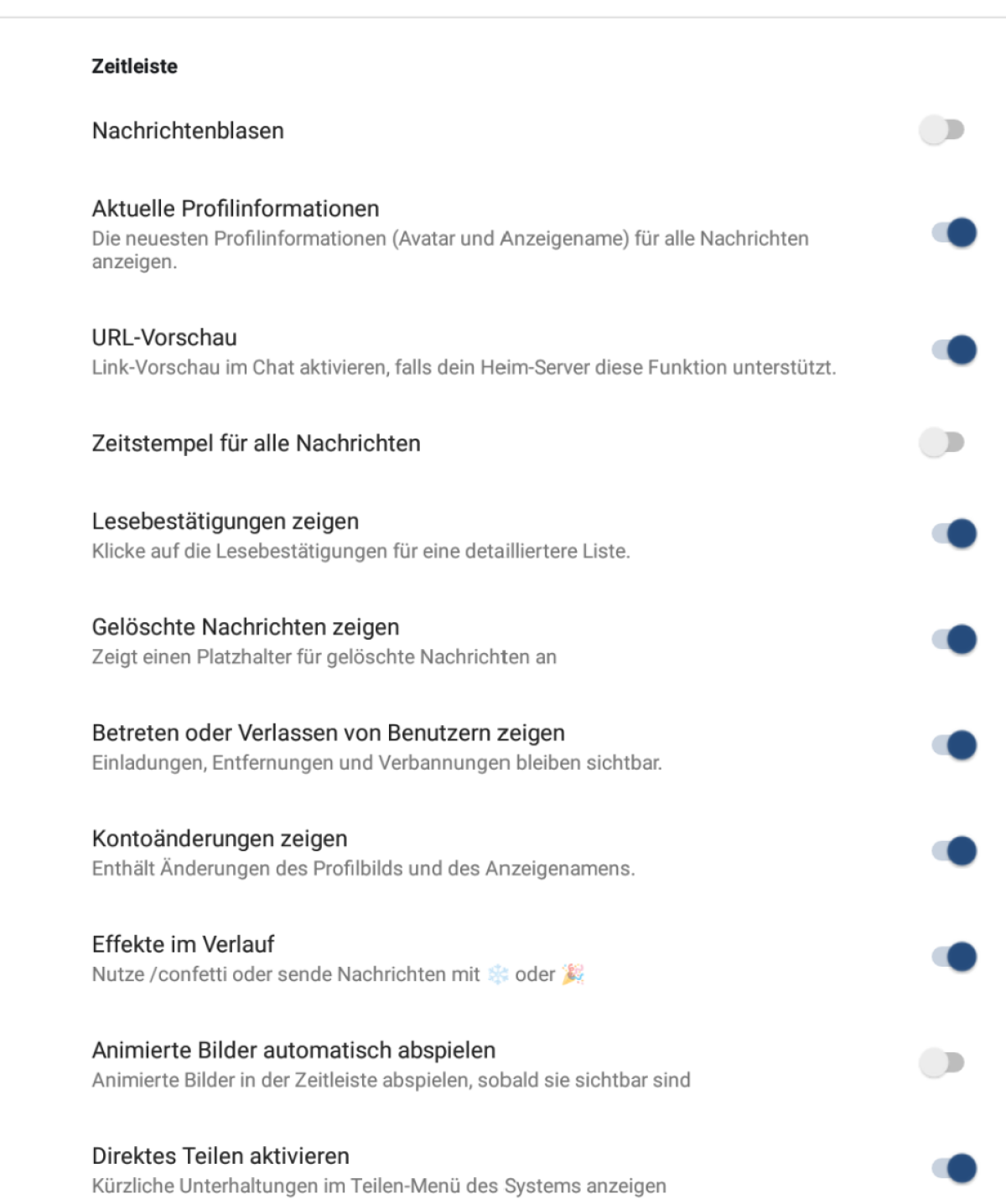 In den Zeitleiste-Einstellungen kannst du festlegen, wie Nachrichten im Chat angezeigt werden. Du entscheidest etwa, ob Profilinformationen wie Name oder Avatar eingeblendet werden, ob gelöschte Nachrichten sichtbar bleiben oder ob Lesebestätigungen angezeigt werden. Außerdem lassen sich visuelle Effekte und Animationen aktivieren. Lege hier fest, ob Systemereignisse wie das Betreten oder Verlassen eines Raums angezeigt werden sollen. Du kannst auch URL-Vorschauen oder das automatische Abspielen von GIFs aktivieren. So lässt sich die Darstellung individuell anpassen – je nachdem, ob man es eher sachlich oder dynamisch mag.