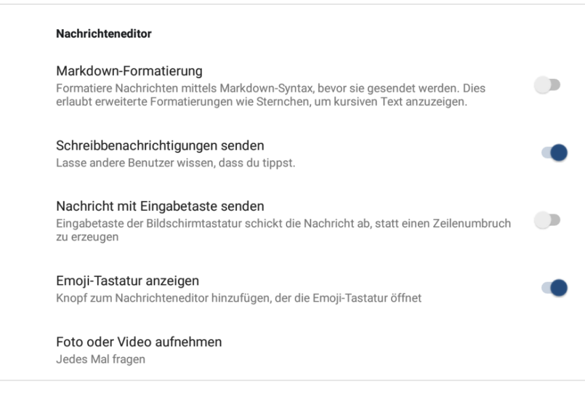 Im Bereich Nachrichteneditor lassen sich verschiedene Einstellungen zum Schreiben und Versenden von Nachrichten anpassen. Du kannst etwa festlegen, ob eine Nachricht per Eingabetaste abgeschickt wird oder ein Zeilenumbruch erzeugt wird. Optional lassen sich Tippanzeigen aktivieren, Emojis über eine eigene Taste einblenden oder Markdown-Formatierungen nutzen (z. B. kursiv oder fett). Außerdem kannst du einstellen, ob beim Öffnen der Kamera automatisch ein Foto oder Video aufgenommen wird – oder ob jedes Mal nachgefragt werden soll.