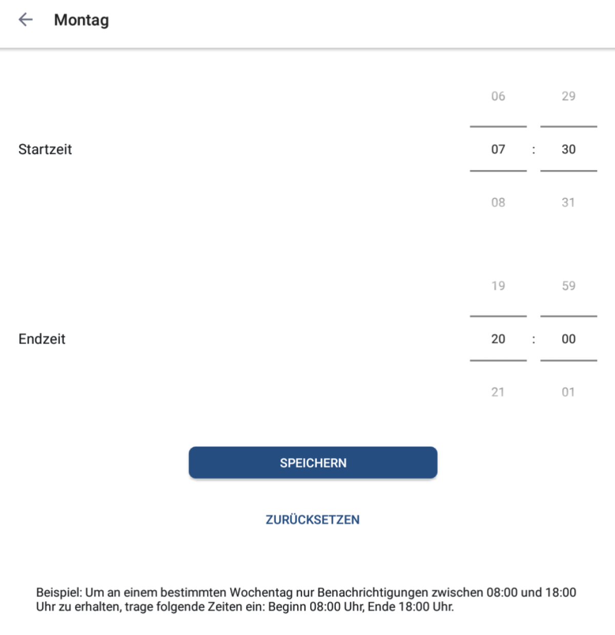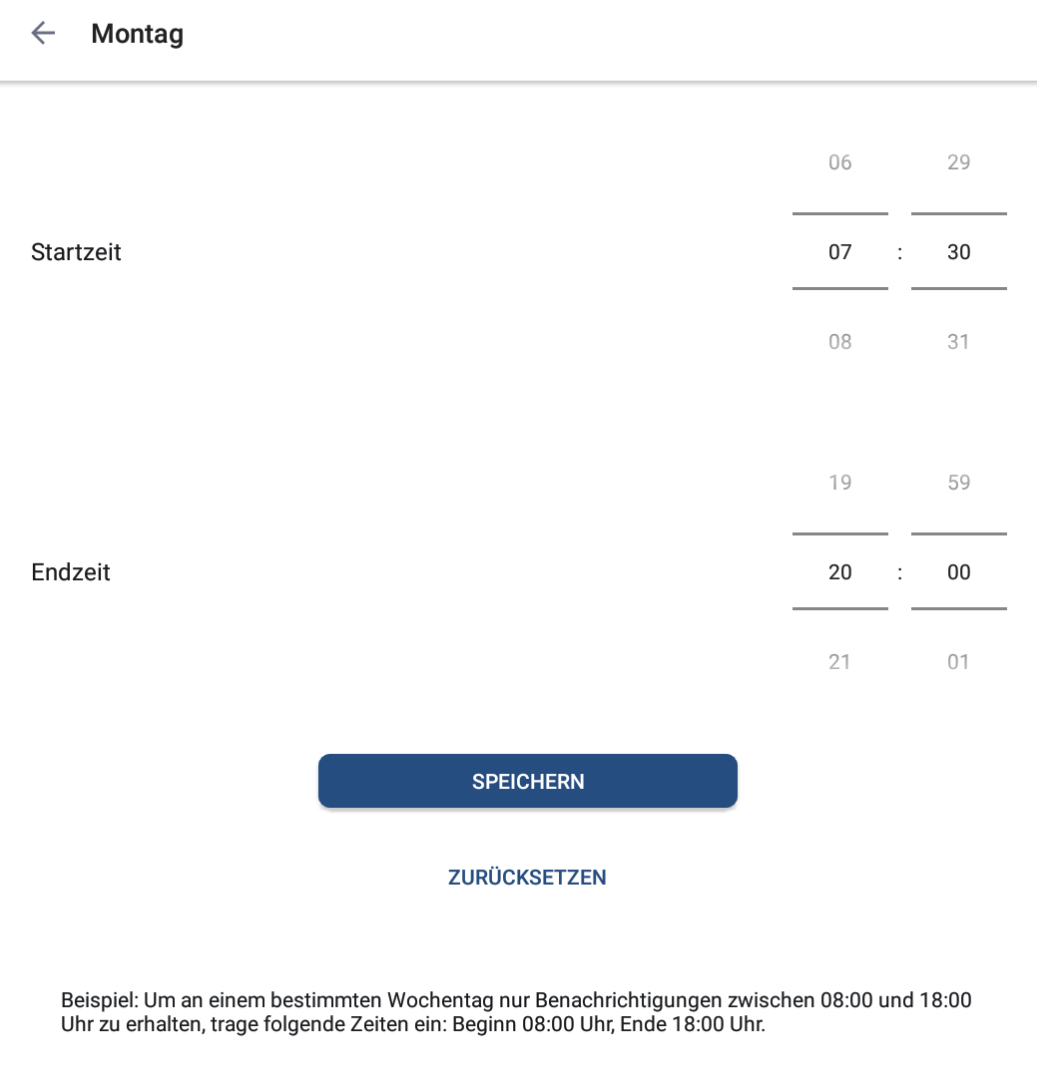 Über Speichern kannst du ausgewählte Einstellungen speichern. Mit Zurücksetzen setzt du den gewählten Wochentag zurück und deaktivierst die Ruhezeiten für den entsprechenden Tag.