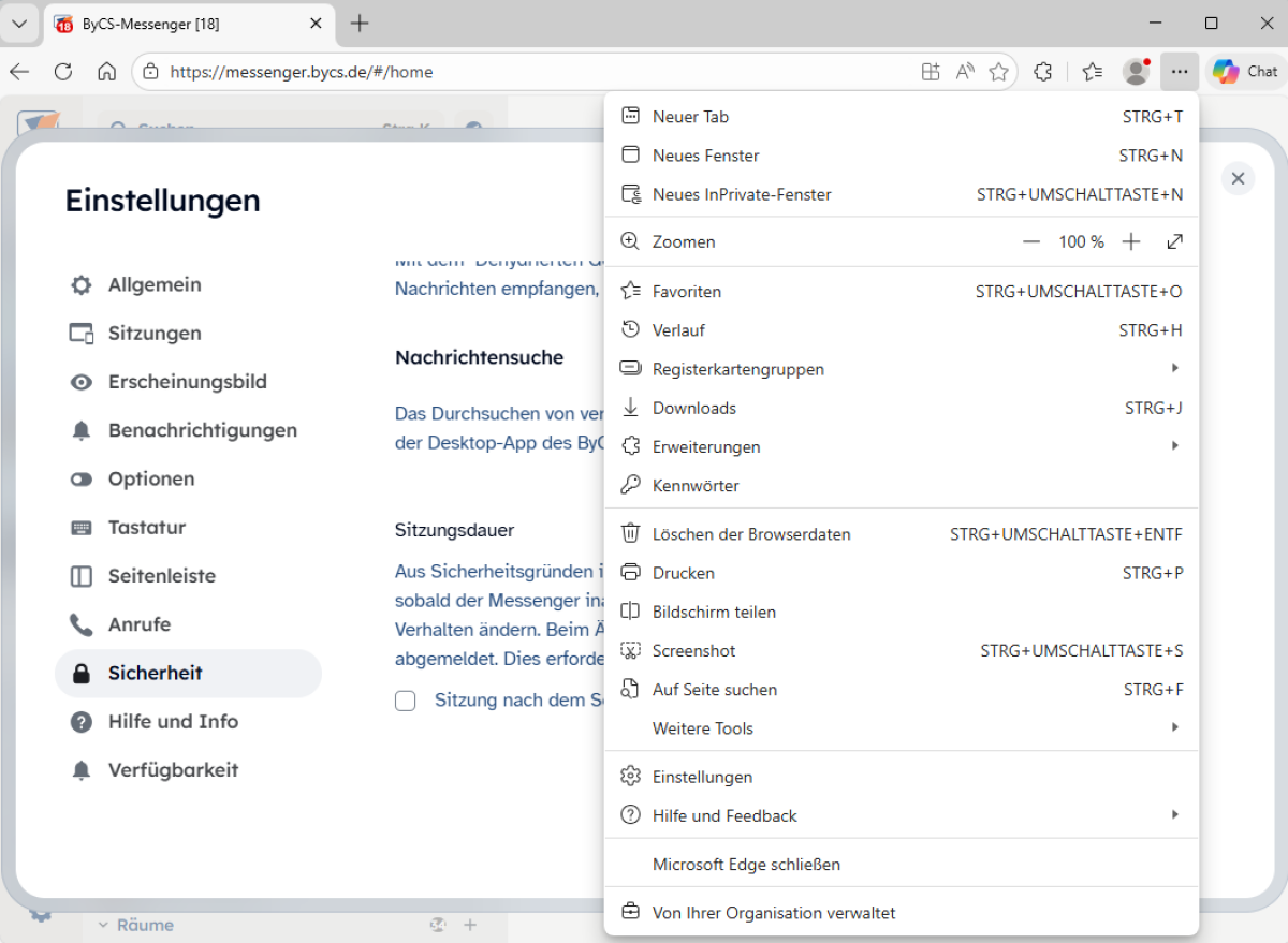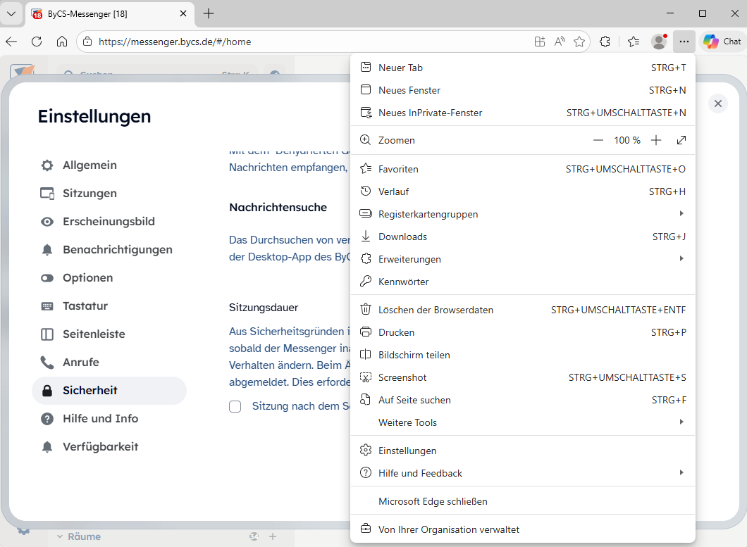 In der linken Seitenleiste finden Sie den Bereich Sicherheit. Dort besteht unter Sitzungsdauer die Möglichkeit, die aus Sicherheitsgründen auf 5 Minuten begrenzte Sitzung zu verlängern. Standardmäßig wird die Sitzung nach 5 Minuten eingestellt. Die 5 Minuten beginnen, sobald der Messenger inaktiv ist.