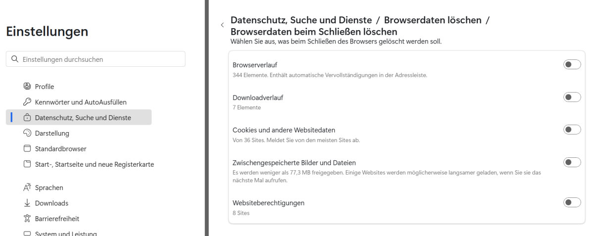 - Ihre Browsereinstellungen erlauben das dauerhafte Speichern von Anmeldedaten und das automatische Löschen (Cache, Cookies, Website-Daten) beim Schließen des Browsers ist deaktiviert.