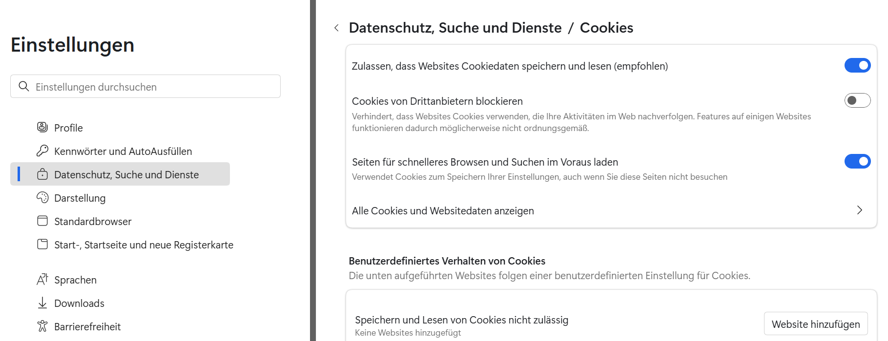 Zusätzlich sollten Sie prüfen, dass die Browserdaten nach dem Schließen des Browserfensters nicht automatisch gelöscht werden.
