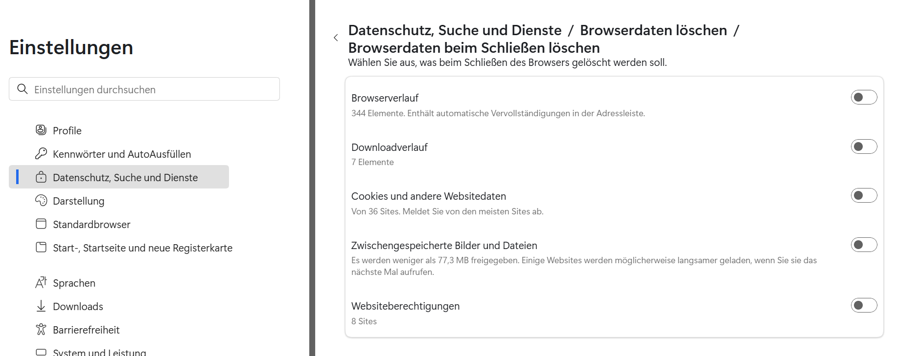 In dem sich öffnenden Fenster klicken Sie auf Wählen Sie aus, was beim Schließen des Browsers gelöscht werden soll. Dort haben Sie die Möglichkeit, Ihre Einstellungen so anzupassen, dass die Browserdaten nicht automatisch gelöscht werden.