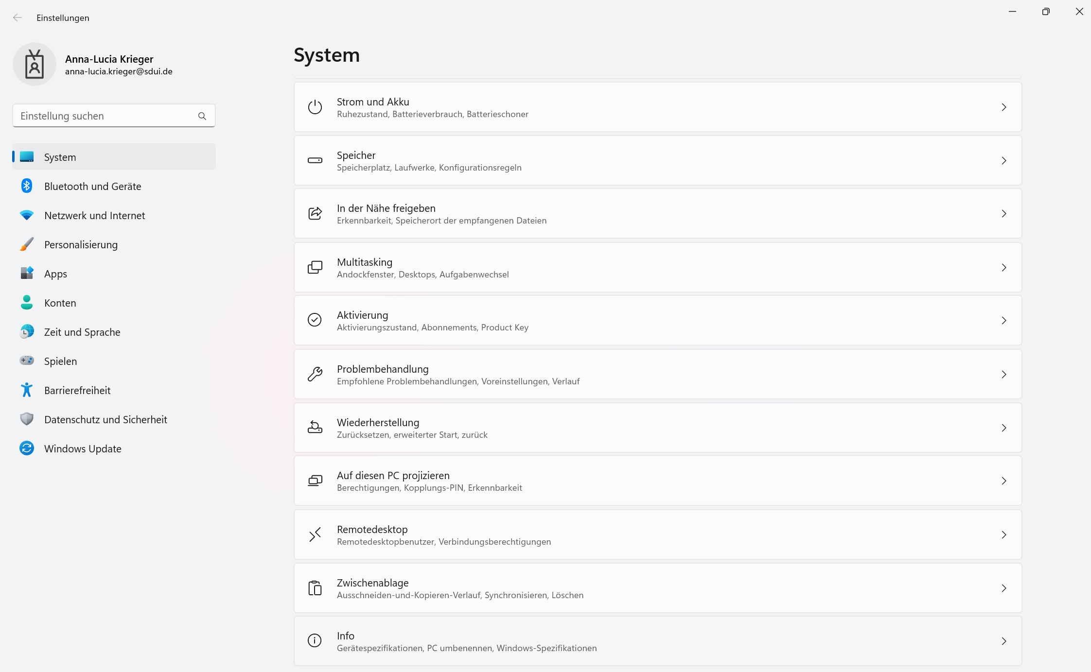 Öffnen Sie auf Ihrem Gerät die Einstellungen, welche sich hinter dem Zahnrad-Symbol befinden. Alternativ nutzen Sie die Suchzeile in der Taskleiste bei einem Windows-Gerät oder öffnen am Mac die Spotlight-Suche, indem Sie die Tastenkombination command + Leerzeichen tätigen, und geben Einstellungen ein. Daraufhin wird Ihnen der gewünschte Bereich angezeigt und kann aufgerufen werden.