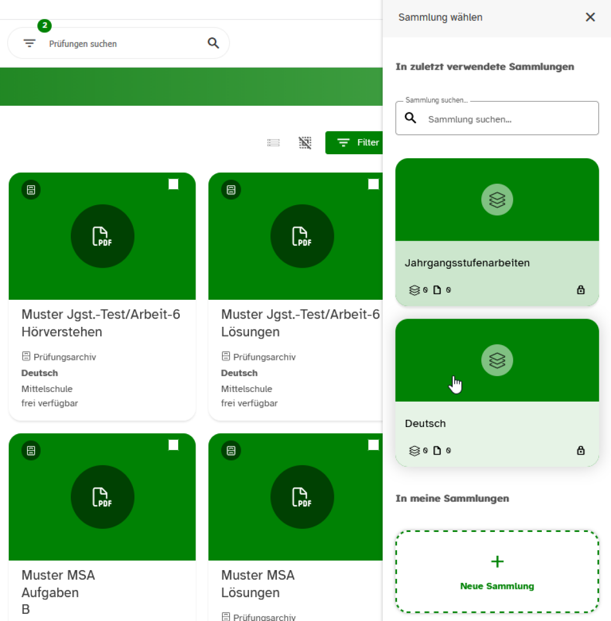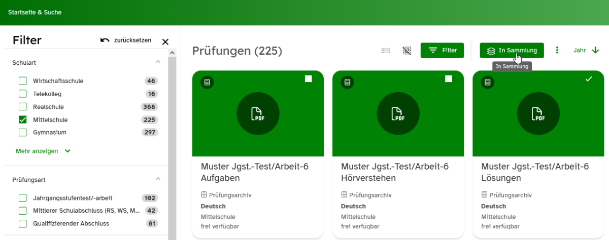 Suche dann wie gewohnt eine geeignete Prüfung aus und setze einen Haken an die Kachel des Mediums. Klicke dann auf In Sammlung und füge sie so der aktuell geöffneten Prüfungssammlung hinzu.