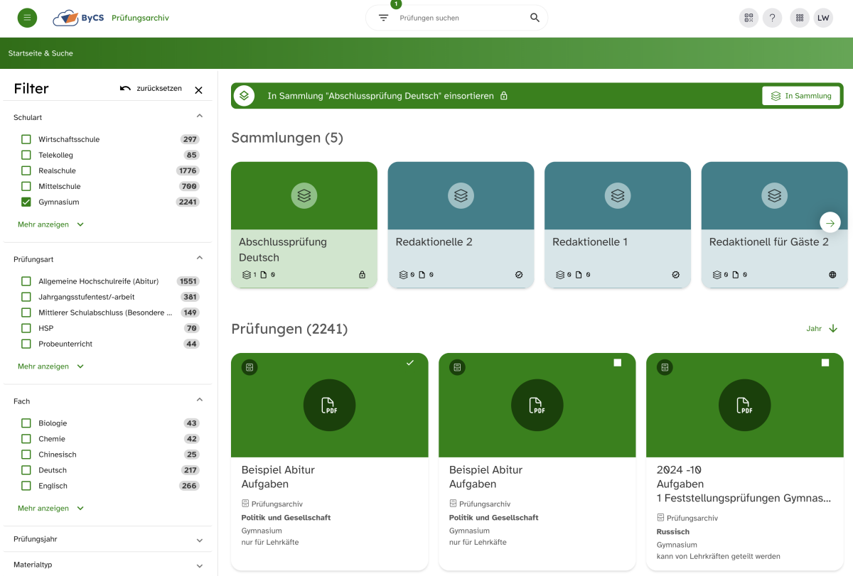 Suchen Sie zunächst nach einer Prüfung, die Sie Ihrer Sammlung hinzufügen wollen. Nutzen Sie dazu die Filter (Prüfungsart, Schulart, Fach etc.) oder geben Sie zusätzlich einen geeigneten Fachbegriff in das Suchfeld ein.