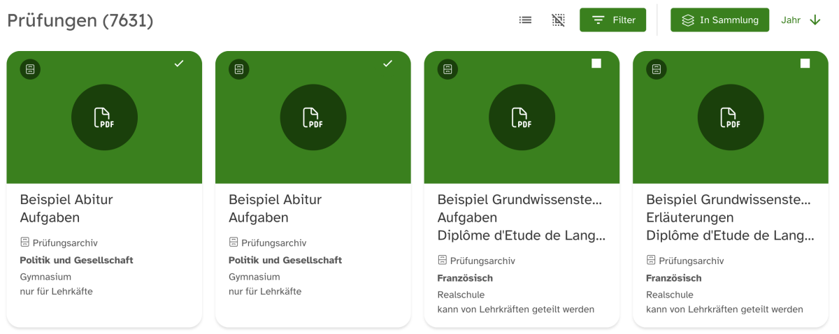 Es erscheinen alle abrufbaren Prüfungen in einer Kachelübersicht. Setzen Sie beim gewünschten Medium einen Haken im quadratischen Kästchen oben rechts in der Kachel und klicken Sie auf In Sammlung.