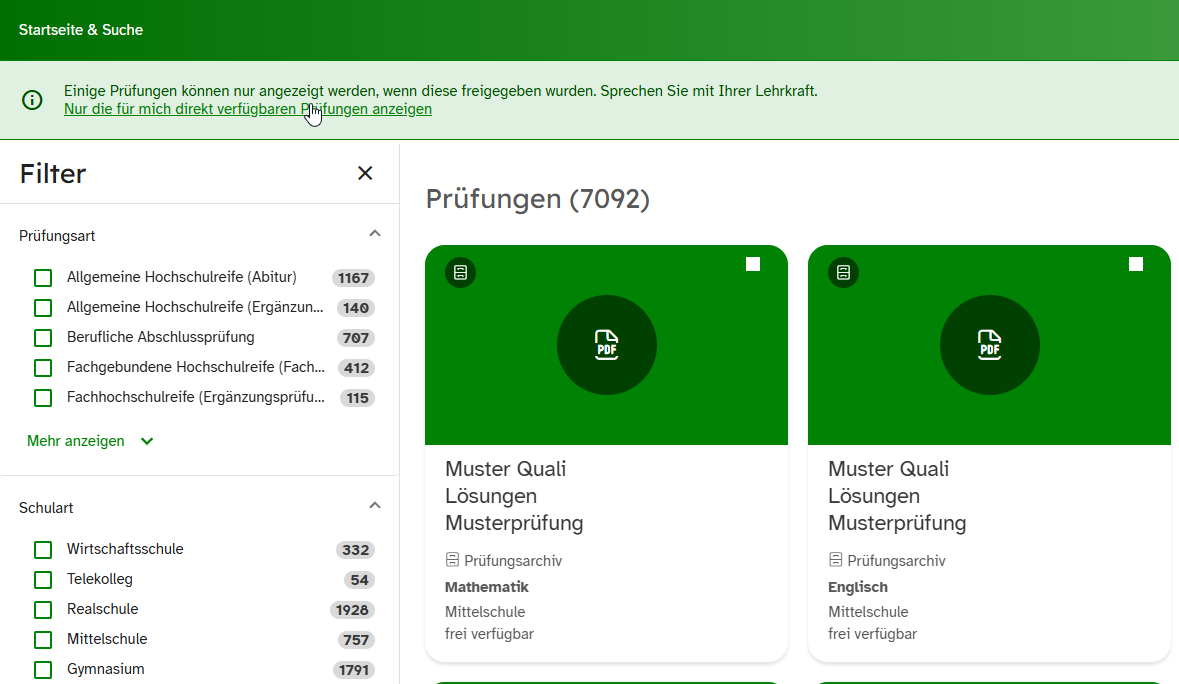 Suchen Sie zunächst nach einer Prüfung, die Sie Ihrer Sammlung hinzufügen wollen. Nutzen Sie dazu die Filter (Prüfungsart, Schulart, Fach etc.) oder geben Sie zusätzlich einen geeigneten Fachbegriff in das Suchfeld ein.