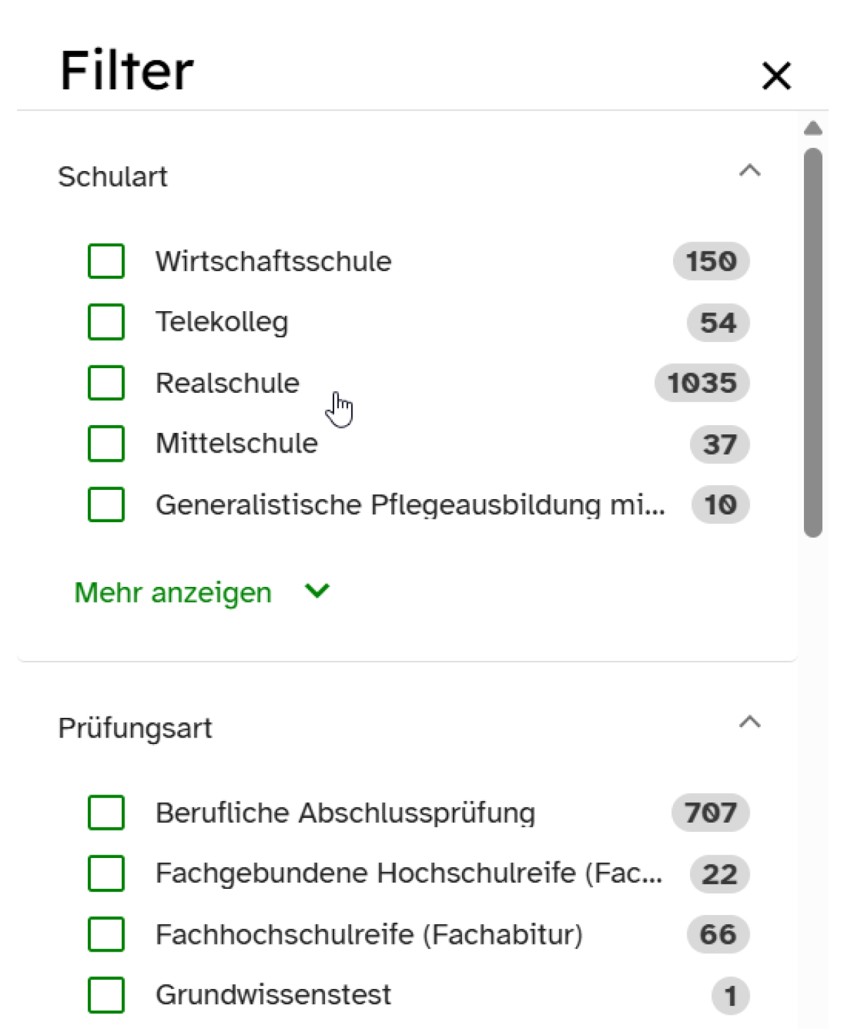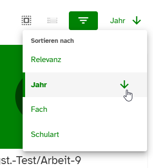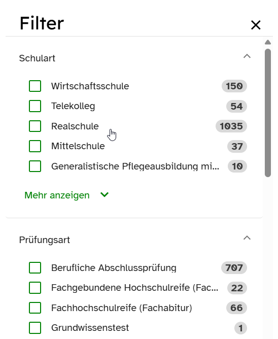 Wähle entsprechende Filter in der Seitenleiste aus. Hierbei ist es möglich, beispielsweise nach Schulart, Prüfungsart, Fach und Prüfungsjahr suchen zu lassen.