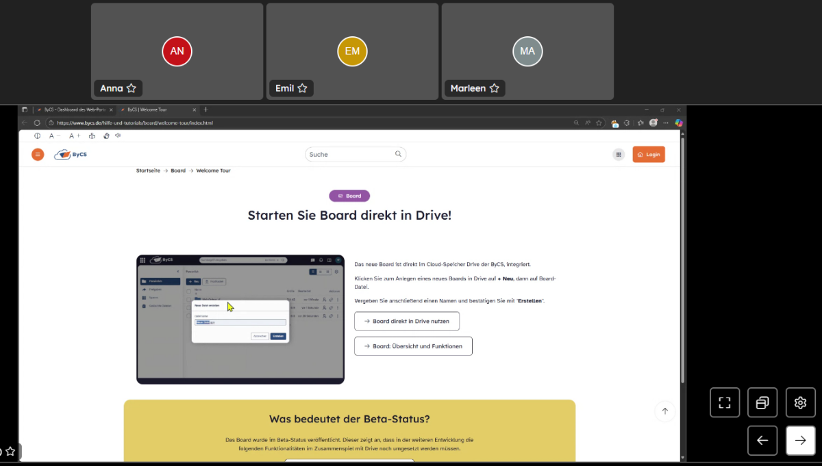 Wenn mehrere Personen ihre Bildschirme teilen, werden in der Anzeige des geteilten Bildschirms zwei Pfeil-Symbole sichtbar. Mit diesen Pfeil-Symbolen ist es möglich, durch die geteilten Bildschirme der Vortragenden zu navigieren.