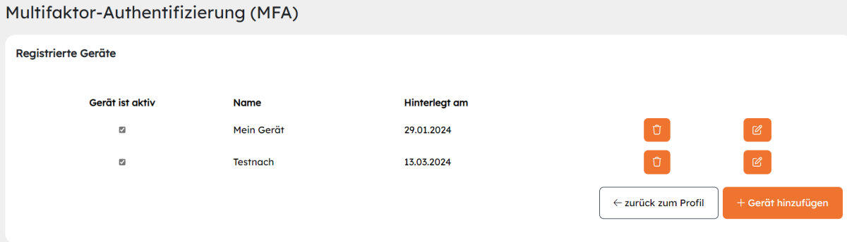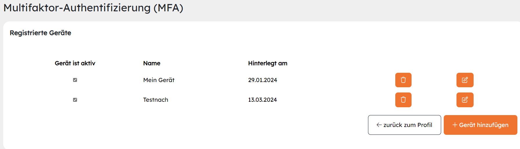 Alle Ihre MFA-Geräte sehen Sie in einer Liste.