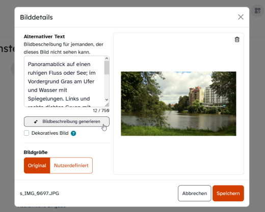 Mithilfe der freigeschalteten KI-Funktionalitäten in der Lernplattform können Sie bequem einen Vorschlag für eine alternative Bildbeschreibung beispielsweise für Nutzende mit Sichteinschränkungen für hochgeladene Bilder erstellen lassen.