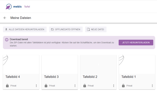 Durch die Funktion "Alle Dateien herunterladen" können Sie Ihre gesamten Tafelbilder mit einem Knopfdruck als Zip-Archiv herunterladen.